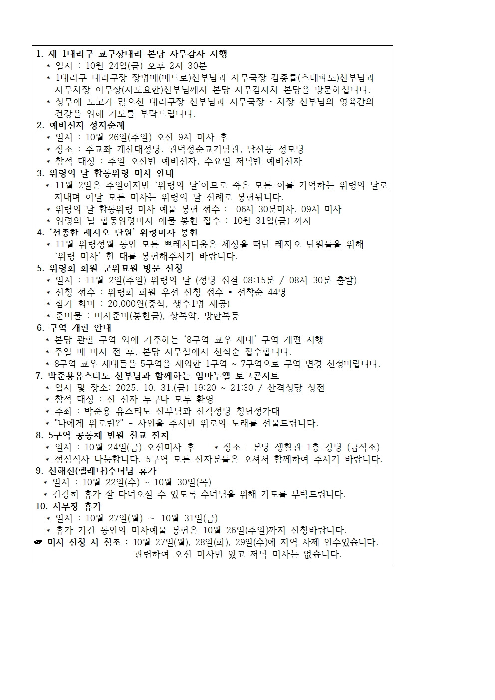 산격성당 2025년 10월 19일(주일) 주보 작성자이데레사|작성시간25.10.19|조회수126 목록 댓글 0 글자크기 작게가 글자크기 크게가 20251019.pdf106.53KB 첨부파일첨부된 파일이 3개 있습니다. jpg 파일 20251019001.jpg 다운로드 jpg 파일 20251019002.jpg 다운로드 pdf 파일 20251019.pdf 다운로드 다음검색 현재 게시글 추가 기능 열기 북마크 공유하기 신고 센터로 신고 댓글 댓글 0 댓글쓰기 답글쓰기 댓글 리스트