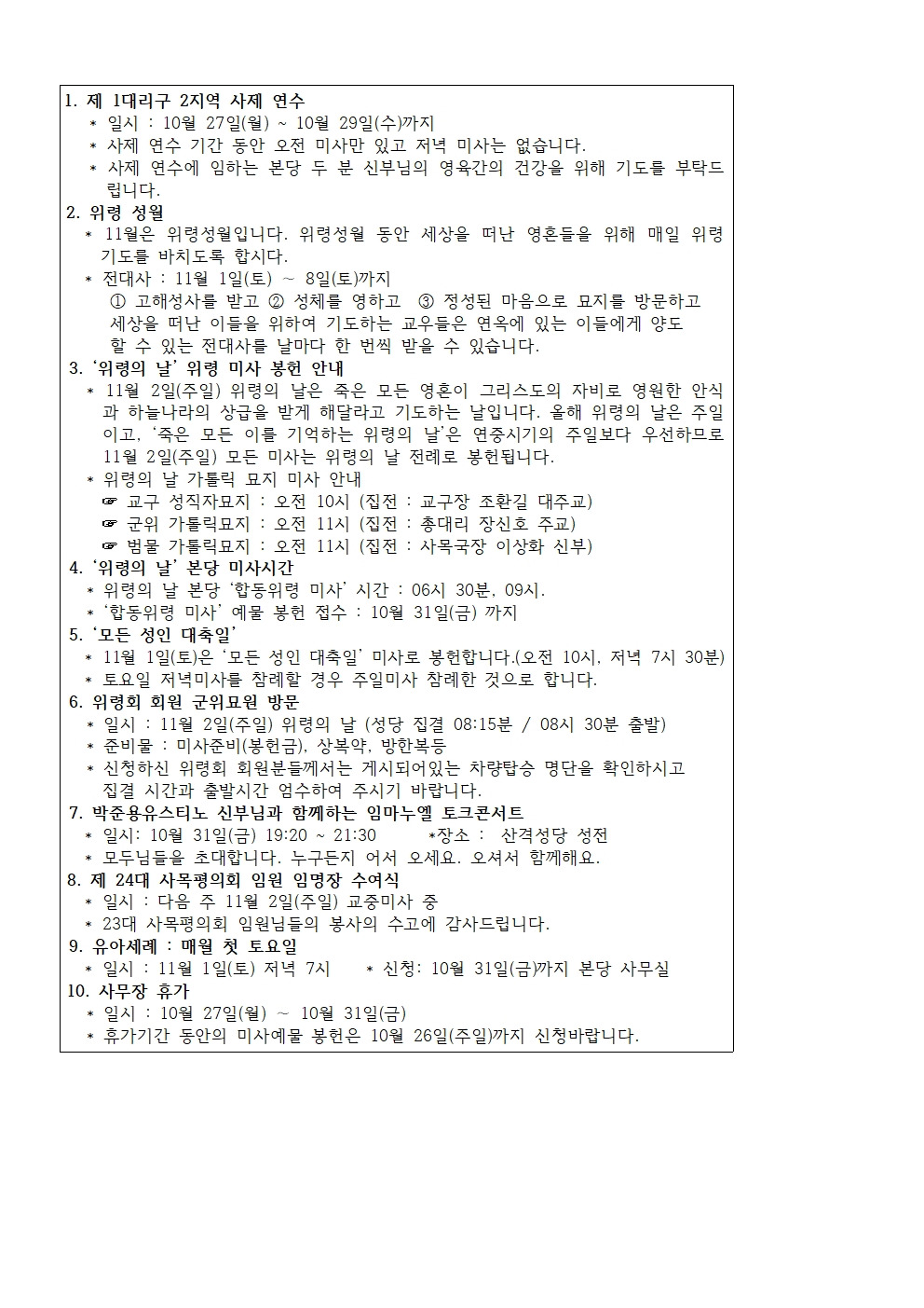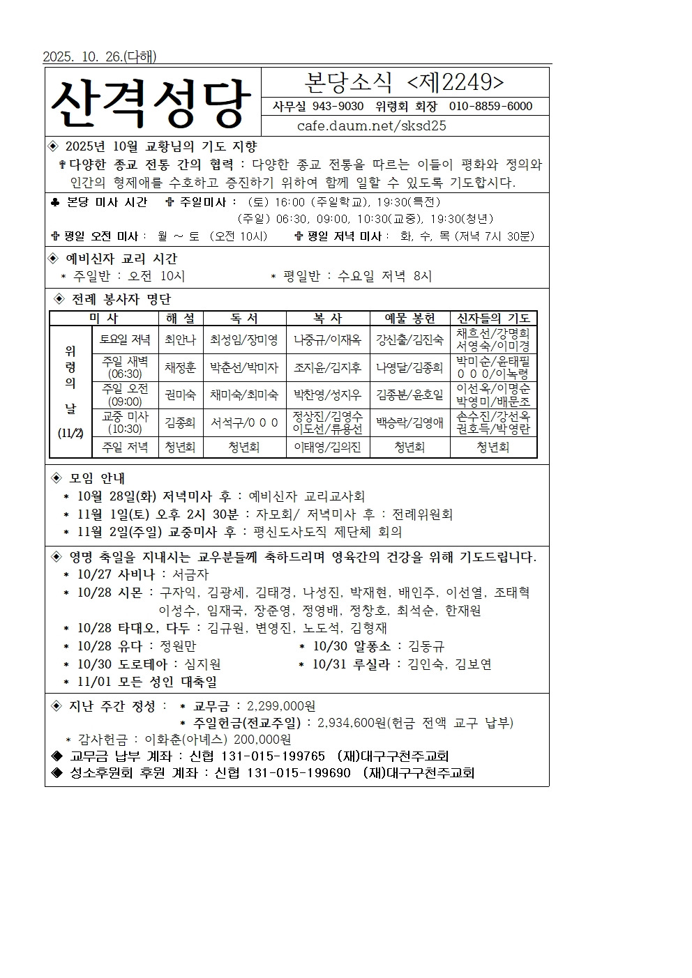 산격성당 2025년 10월 26일(주일) 주보 작성자이데레사|작성시간25.10.27|조회수148 목록 댓글 0 글자크기 작게가 글자크기 크게가 20251026.pdf102.47KB 첨부파일첨부된 파일이 3개 있습니다. jpg 파일 20251026001.jpg 다운로드 jpg 파일 20251026002.jpg 다운로드 pdf 파일 20251026.pdf 다운로드 다음검색 현재 게시글 추가 기능 열기 북마크 공유하기 신고 센터로 신고 댓글 댓글 0 댓글쓰기 답글쓰기 댓글 리스트