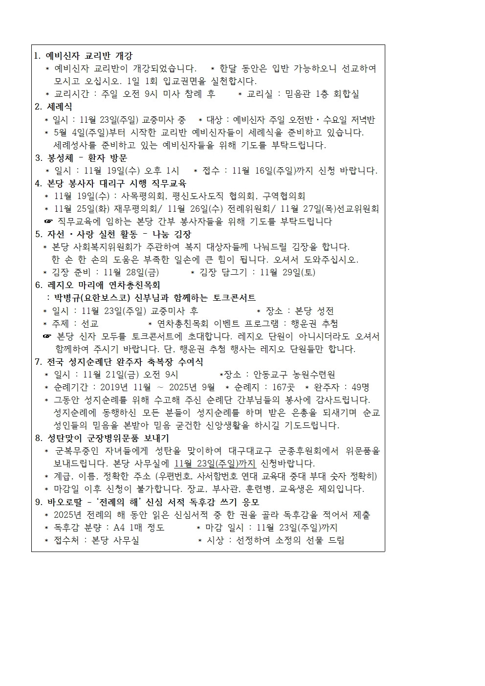 산격성당 2025년 11월 16일(주일) 주보 작성자이데레사|작성시간25.11.16|조회수139 목록 댓글 0 글자크기 작게가 글자크기 크게가 20251116.pdf103.70KB 첨부파일첨부된 파일이 3개 있습니다. jpg 파일 20251116001.jpg 다운로드 jpg 파일 20251116002.jpg 다운로드 pdf 파일 20251116.pdf 다운로드 다음검색 현재 게시글 추가 기능 열기 북마크 공유하기 신고 센터로 신고 댓글 댓글 0 댓글쓰기 답글쓰기 댓글 리스트