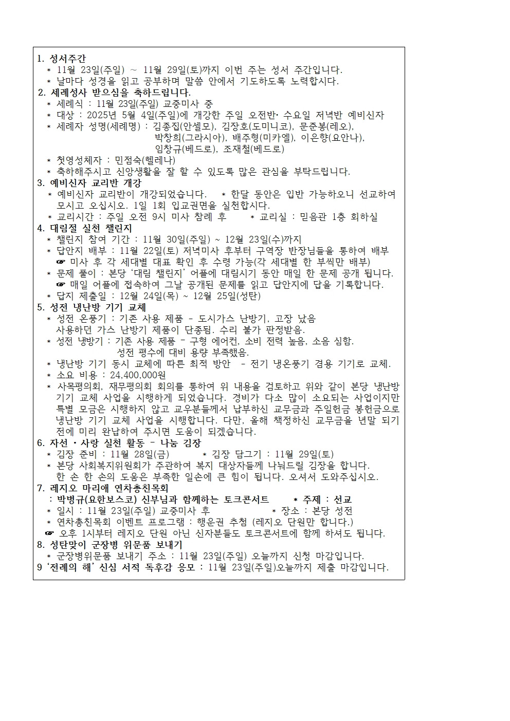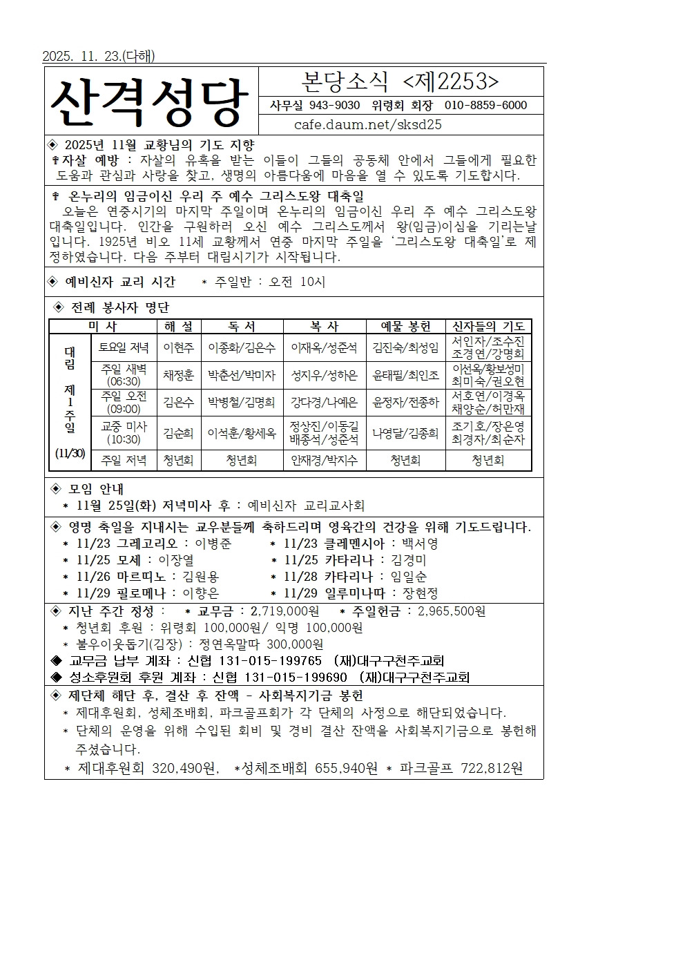 산격성당 2025년 11월 23일(주일) 주보 작성자이데레사|작성시간25.11.23|조회수122 목록 댓글 0 글자크기 작게가 글자크기 크게가 20251123.pdf109.18KB 첨부파일첨부된 파일이 3개 있습니다. jpg 파일 20251123001.jpg 다운로드 jpg 파일 20251123002.jpg 다운로드 pdf 파일 20251123.pdf 다운로드 다음검색 현재 게시글 추가 기능 열기 북마크 공유하기 신고 센터로 신고 댓글 댓글 0 댓글쓰기 답글쓰기 댓글 리스트
