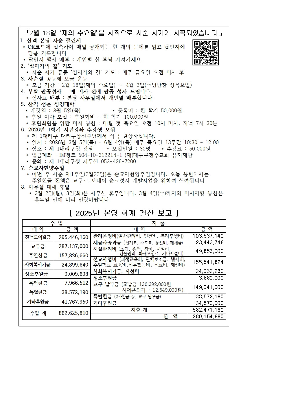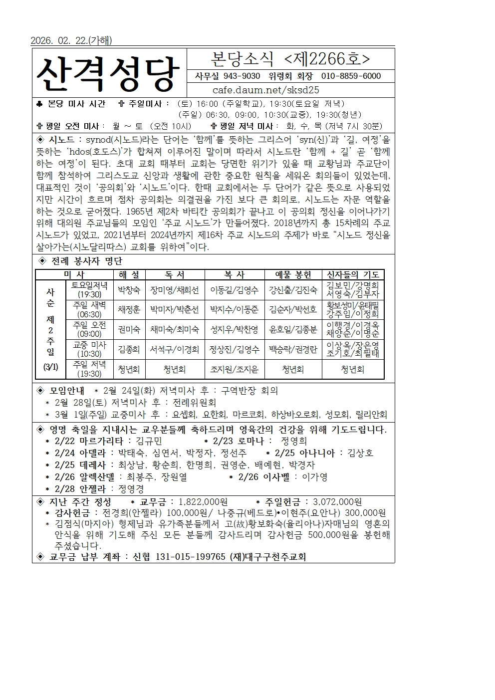 산격성당 2026년 02월 22일(주일) 주보 작성자이데레사|작성시간26.02.22|조회수127 목록 댓글 0 글자크기 작게가 글자크기 크게가 20260222.pdf126.06KB 첨부파일첨부된 파일이 3개 있습니다. jpg 파일 20260222001.jpg 다운로드 jpg 파일 20260222002.jpg 다운로드 pdf 파일 20260222.pdf 다운로드 다음검색 현재 게시글 추가 기능 열기 북마크 공유하기 신고 센터로 신고 댓글 댓글 0 댓글쓰기 답글쓰기 댓글 리스트