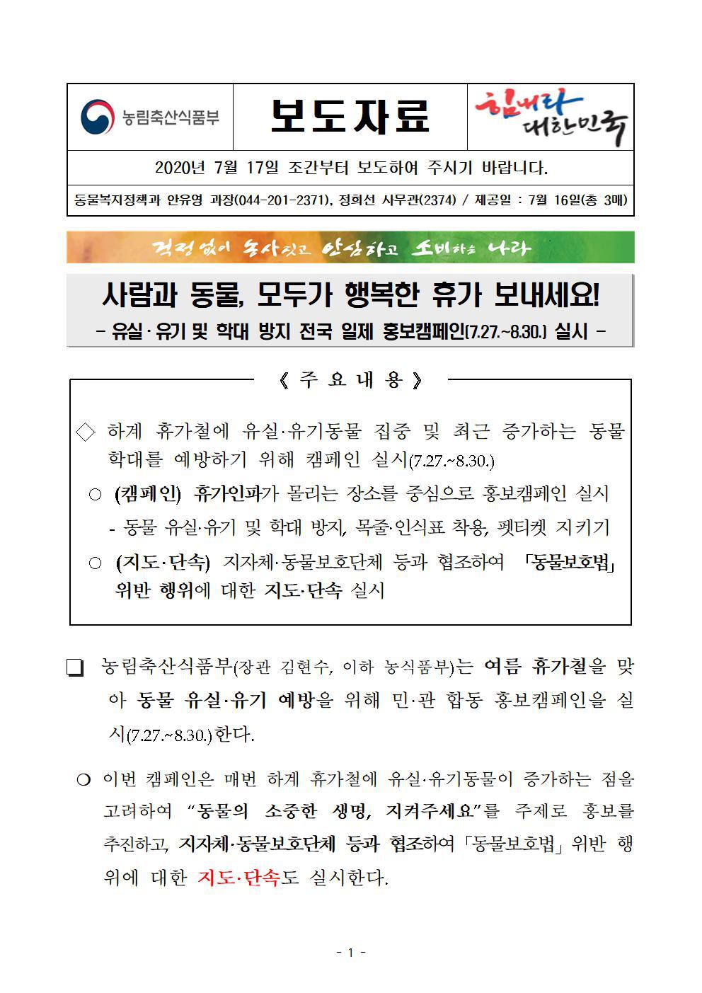 7월 27일~ 8월 30일까지 휴가철 유기및 유실 , 학대예방 홍보 캠페인이 전국 일제 시작 됩니다~