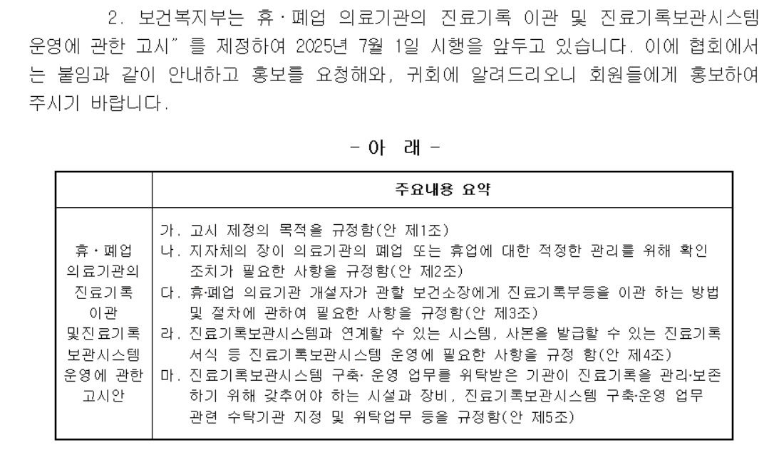 휴·폐업 의료기관의 진료기록 이관 및 진료기록보관시스템 운영에 관한 고시 제정 안내 작성자금천구사무국|작성시간25.05.08|조회수11 목록 댓글 0 글자크기 작게가 글자크기 크게가 휴폐업_의료기관_진료기록_관리_관련_고시_제정_안내.hwp86.50KB휴폐업_의료기관의_진료기록_이관_및_진료기록보관시스템_운영에_관한_고시_제정.hwp61.50KB 첨부파일첨부된 파일이 3개 있습니다. etc 파일 휴폐업.JPG 다운로드 hwp 파일 휴폐업_의료기관_진료기록_관리_관련_고시_제정_안내.hwp 다운로드 hwp 파일 휴폐업_의료기관의_진료기록_이관_및_진료기록보관시스템_운영에_관한_고시_제정.hwp 다운로드 다음검색 현재 게시글 추가 기능 열기 북마크 공유하기 신고 센터로 신고 댓글 댓글 0 댓글쓰기 답글쓰기 댓글 리스트