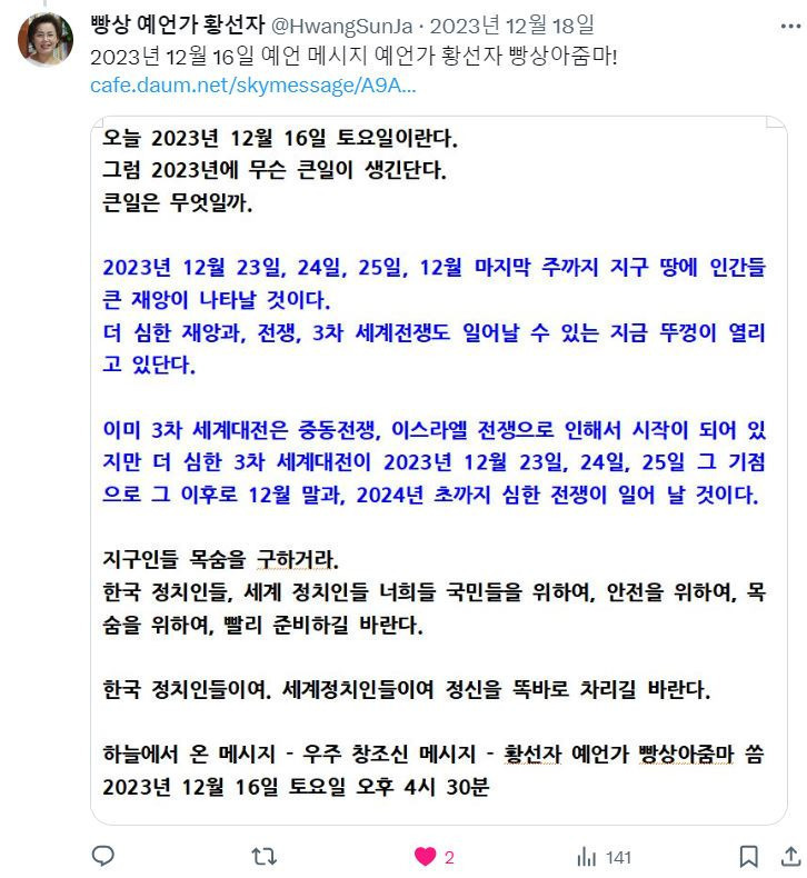 한국땅 석유 가스 예언 트위터↓황선자 예언가 빵상