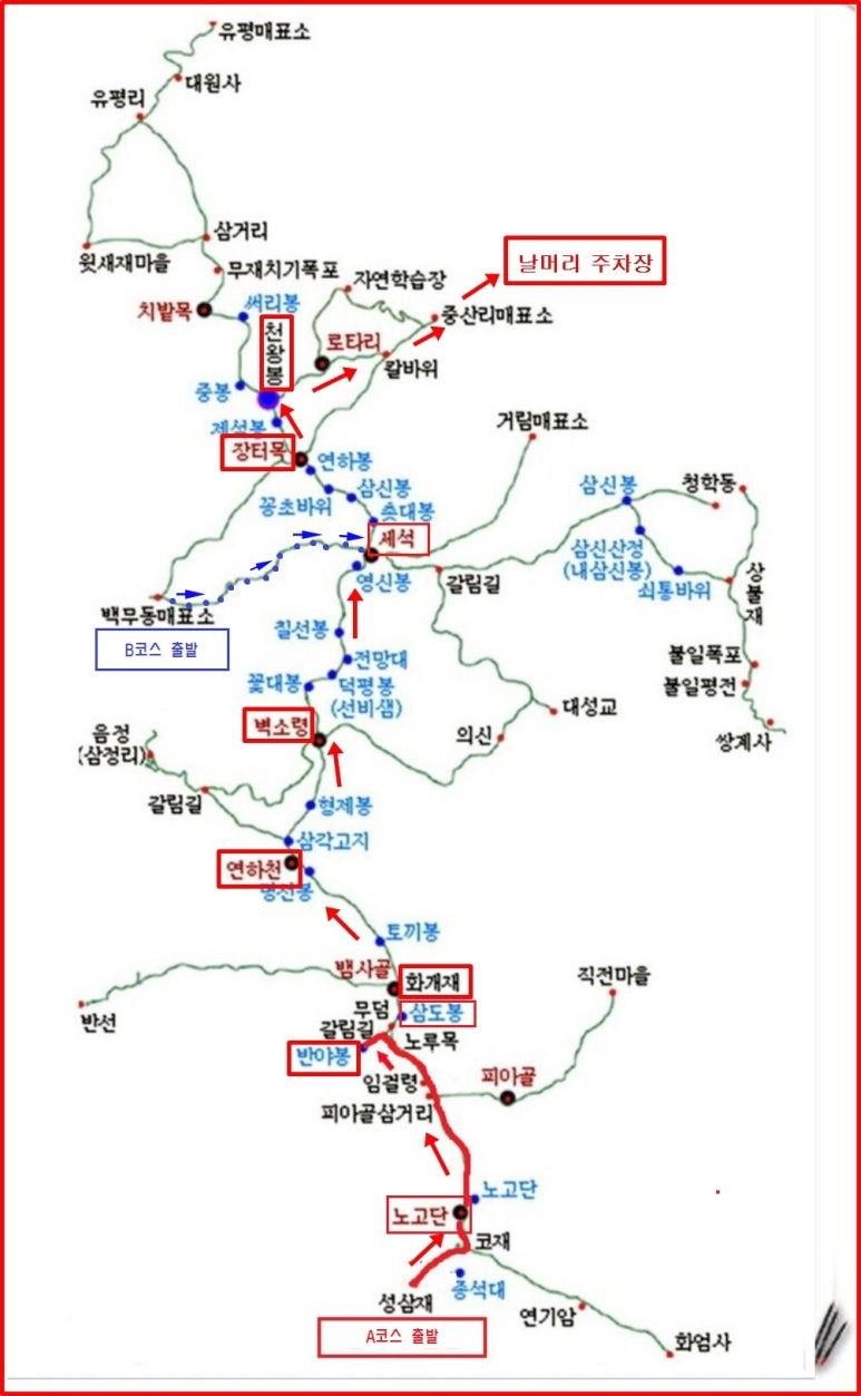 | 코 스 | <A코스> 성삼재~노고단~임걸령삼거리(반야봉왕복선택)~삼도봉~화개재~토끼봉~연하천~벽소령~영신봉~세석~장터목~천왕봉~중산리(약34km) <B-1코스> 백무동~한신계곡~ 세석~장터목~천왕봉~중산리 <B코스> 백무동~장터목~천왕봉~중산리 <C코스> 중산리~법계사~천왕봉~장터목~중산리 <VIP코스> 중산리~법계사(버스이동)~천왕봉~법계사(버스)~중산리 <VVIP> 중산리일대 내맘대로 산행 |