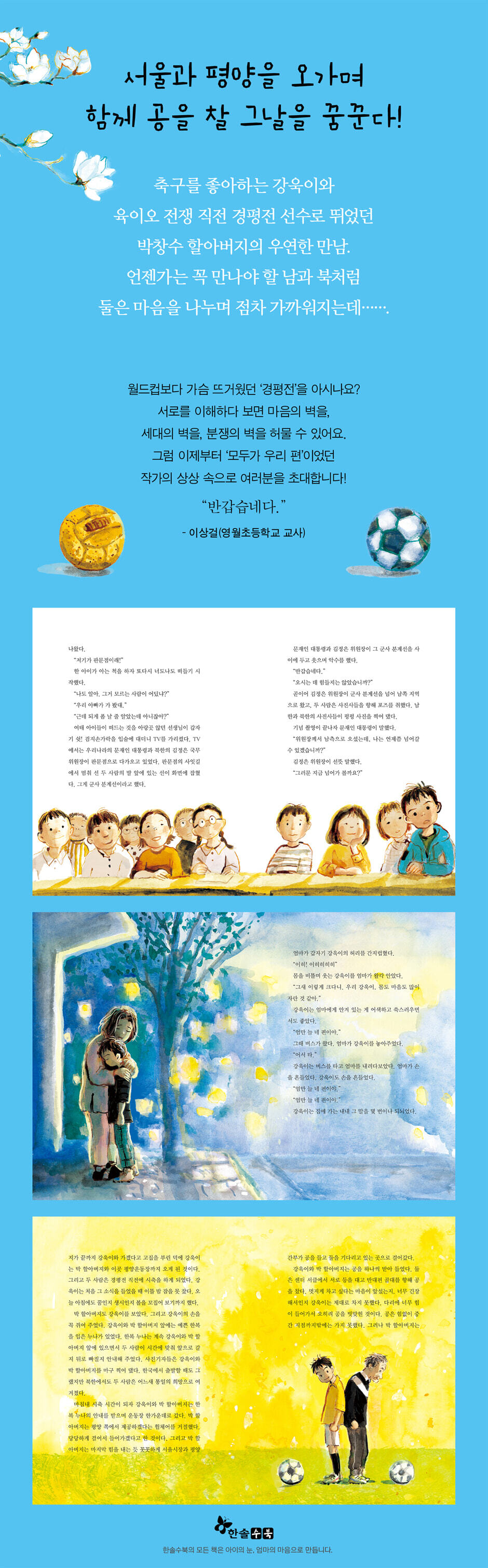 2018년 4월 27일. 우리나라 사람들은 두 손을 꼬옥 모으고 TV 앞에 앉아 남북 두 정상의 만남을 지켜보고 있었지요. 그때는 금방이라도 통일을 이룰 듯 평화롭고 화기애애한 분위기가 감돌았고 모두들 아름다운 꿈을 꾸듯 ‘통일’에 대해 이야기했습니다. 그리고 사람들의 기억 속에서 잊혔던 ‘경평전’을 되살리자는 이야기도 그때 나왔습니다. ‘경평전’은 일제 강점기에 처음 열린 경성(지금의 서울)과 평양의 축구 대항전으로, 1929년부터 1935년 사이에 여러 차례 열렸다고 합니다. 그러다 해방 직후인 1946년에 경성에서 다시 열리게 되었는데, 이때 평양 대표선수로 남한에 왔던 축구 선수 한 명이 이 이야기의 주인공입니다.