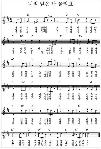 1.내일일은 난 몰라도 하루하루 살아요 불행이나 요행함도 내 뜻대로 못해요 험한이길 가도가도 끝이없고 곤해요 주님 예수 팔 내미사 내손잡아 주소서 내일일은 난 몰라요 장래일도 몰라요 아버지여 날 붙드사 평탄한길 주옵소서.