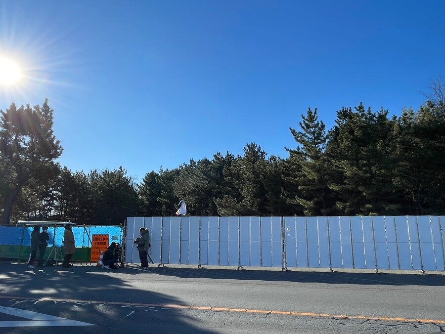 일본 군마현이 29일 오전 다카사키시에 있는 ‘군마의 숲’ 공원 후문 입구에 세로 2m, 가로 20m 크기의 대형 가림막을 새로 만들어 아무도 접근하지 못하게 해놓고 강제동원 조선인 희생자 추도비 철거 작업을 시작했다. 다카사키/김소연 특파원