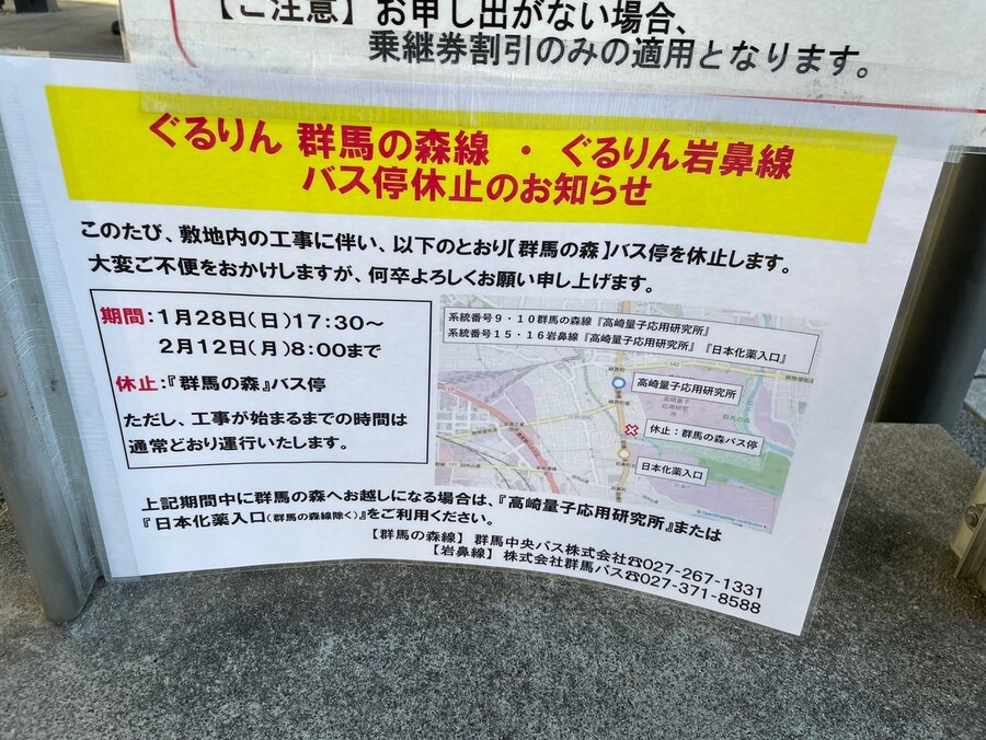 일본 군마현 시내버스에 ‘조선인 추도비’ 철거 기간인 다음달 12일 아침 8시까지 ‘군마의 숲’ 공원 정류장에 정차하지 않는다는 안내문이 붙어 있다. 다카사키/김소연 특파원