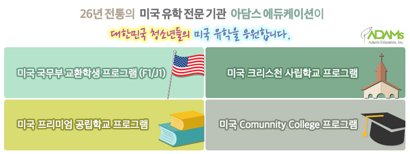 작성자김은경 이사작성시간16.01.07조회수2,034 목록 댓글 0[26년 전통의 미국유학전문기관 아담스에듀케이션]