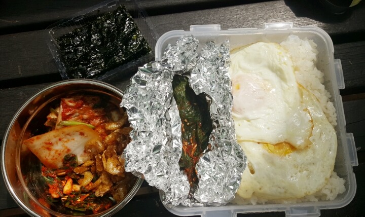 점심 계란후라이1,깻잎장아찌1/2,겉절이1/2,마른새우볶음1/2,파김치1/2,김1/2, 밥1/2