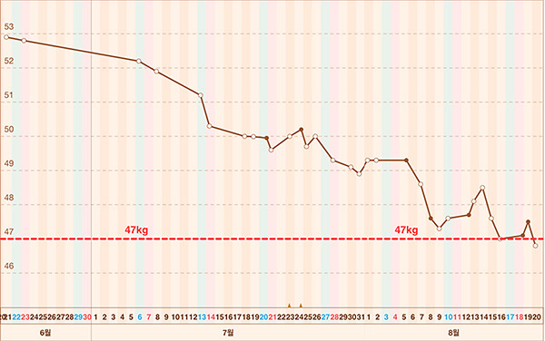53~52kg까진 데일리운동만 했구요. 그래프보시면 알겠지만 1kg 빼는게 엄청 오래걸렸죠?