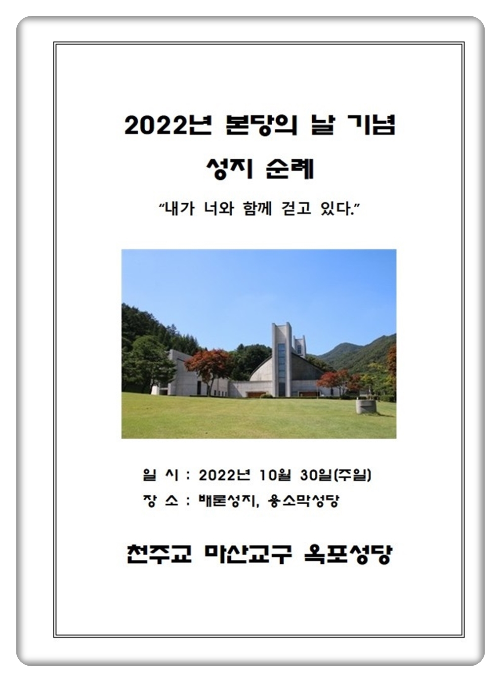 2022년 본당의 날 기념 성지 순례1 - 2022.10.30 작성자세례자 요한|작성시간22.10.31|조회수192 목록 댓글 0 글자크기 작게가 글자크기 크게가 2022년 본당의 날 기념 성지 순례1 - 2022.10.30본당 사목회 박무용(프란치스코)부회장님 및 이현석(안드레아)총무님께서 사진자료 제공해 주셨습니다. 감사드립니다. 다음검색 현재 게시글 추가 기능 열기 북마크 신고 센터로 신고 댓글 댓글 0 댓글쓰기 답글쓰기 댓글 리스트