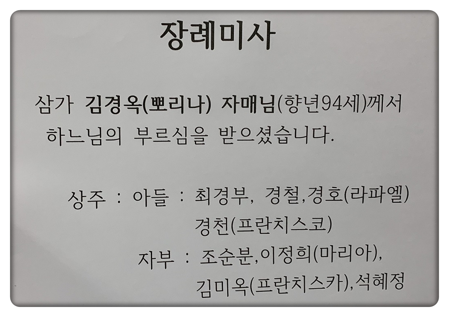 장례미사 - 故 김경옥(뽀리나) 자매님 2022.11.10 작성자세례자 요한|작성시간22.11.11|조회수124 목록 댓글 0 글자크기 작게가 글자크기 크게가 레지오 장례미사 - 故 김경옥(뽀리나) 자매님 2022.11.10장례미사 사진자료 보내오신 여 마리아 본당 사무장님께 감사드립니다. 다음검색 현재 게시글 추가 기능 열기 북마크 신고 센터로 신고 댓글 댓글 0 댓글쓰기 답글쓰기 댓글 리스트