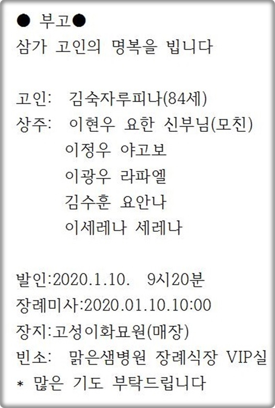 고 김숙자 루피나 (이현우 신부님 모친) 장례미사가 2020.01.10 금요일에
