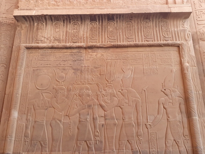 <2 탑문 벽화 중 훼손 없이 등장인물도 가장 많은 그림. 왼쪽부터 지혜의 신 토트와 미의 여신 호루스가 파라오의 왕관을 씌워주고 있으며 파라오 오른쪽으로는 사자 얼굴의 세크메트와 매의 얼굴 호루스가 파라오에게 생명의 열쇠 앙크를 건네는 모습이다. 이렇게 대단한 축복을 받는 파라오는 프톨레마이오스 7세로 전해진다.>