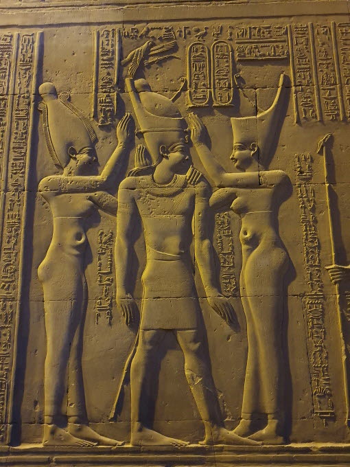 <파피루스 기둥에 새겨진 부조. 상하 이집트 왕관을 쓴 매의 얼굴 호루스에게 두 뿔 사이에 태양 원반이 있는 미의 여신 하토르가 무언가 건네는 모습이다.>