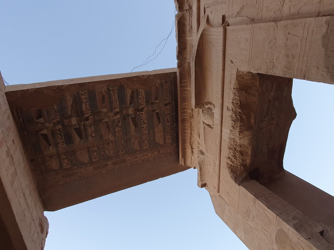 <신전의 높은 지붕에는 아부심벨에서 보았던 날개 편 독수리, 진리와 정의의 여신이며 태양신 레의 딸 마아트(Maat)가 그려져 있는데 자세히 보면 채색이 되었던 듯하다. 아마 다른 벽화에도 채색을 하지 않았을까 하는 생각이 든다.>