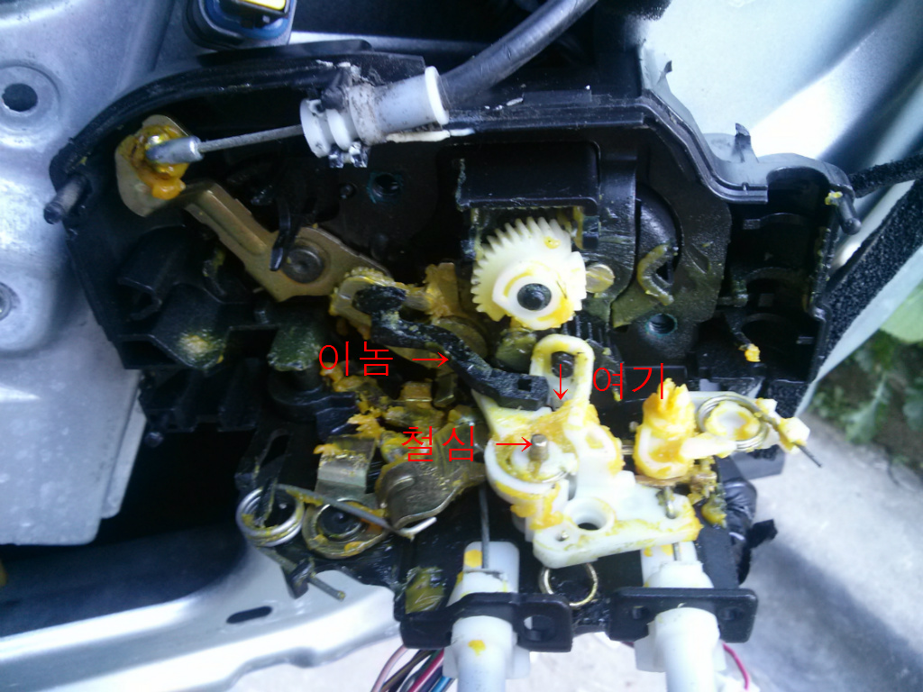분해 하고 나면 두번째 사진에서 화살표 부분 깨끛히 닦아 주고 나서 도어록 박스 안에 묻어 있는 구리스를 살짝 찍어 발라 줍니다.