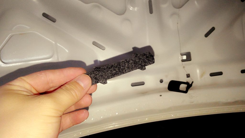 이렇게 먼저 붙이고 나서 종이를 떼고 트렁크 구멍의 바깥쪽에서 안쪽으로
