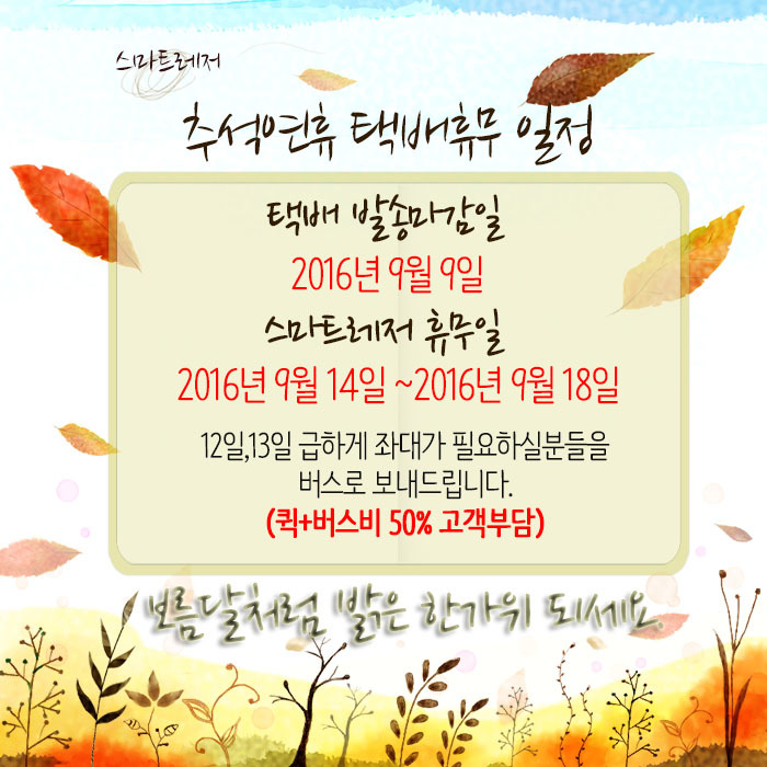 2016년 추석연휴 택배휴무일 작성자스마트붕어|작성시간16.09.02|조회수115 목록 댓글 0 글자크기 작게가 글자크기 크게가 다음검색 현재 게시글 추가 기능 열기 북마크 공유하기 신고 센터로 신고 댓글 댓글 0 댓글쓰기 답글쓰기 댓글 리스트