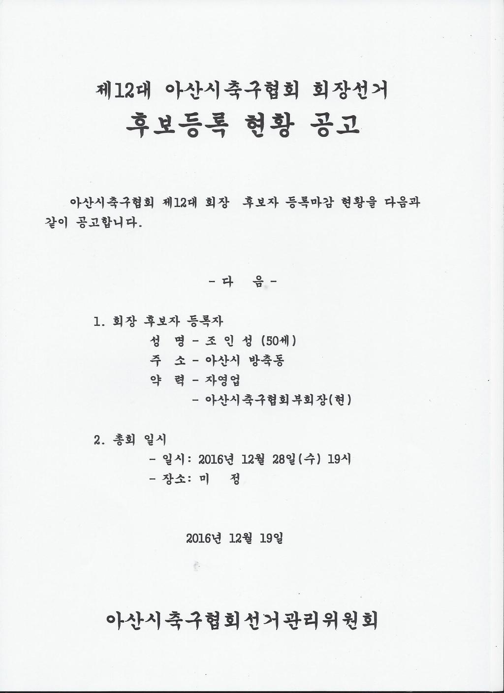 제12대 아산시축구협회 회장선거 후보등록현황 및 선거관리위원명단 공고 작성자우거지|작성시간16.12.19|조회수540 목록 댓글 0 글자크기 작게가 글자크기 크게가 다음검색 현재 게시글 추가 기능 열기 북마크 공유하기 신고 센터로 신고 댓글 댓글 0 댓글쓰기 답글쓰기 댓글 리스트