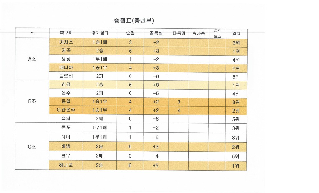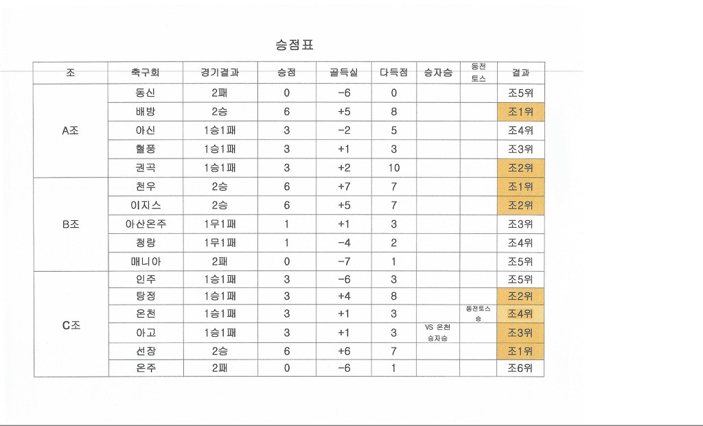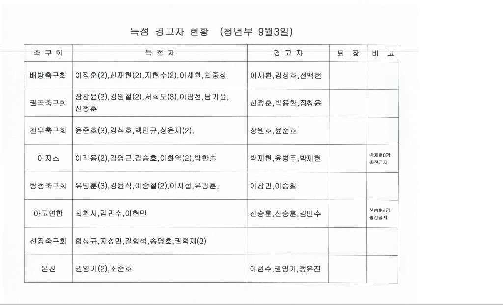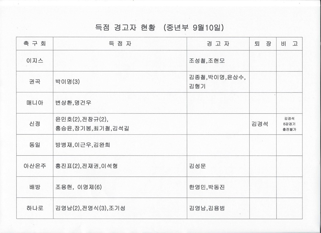 청년부 중년부 승점표 및 득점자, 경고자 현황입니다 작성자우거지|작성시간17.09.11|조회수404 목록 댓글 2 글자크기 작게가 글자크기 크게가 다음검색 현재 게시글 추가 기능 열기 북마크 공유하기 신고 센터로 신고 댓글 댓글 2 댓글쓰기 답글쓰기 댓글 리스트 작성자우거지 작성자 본인 여부 작성자 | 작성시간 17.09.11 9월 21일(목) 오후7시 사무국에서 8강 대진추첨 합니다 8강진출팀(노란색) 대표자님들 꼭 참석하시기 바랍니다 작성자우거지 작성자 본인 여부 작성자 | 작성시간 17.09.12 배방 경고자중 이규만을 박동진으로 수정합니다 댓글 전체보기