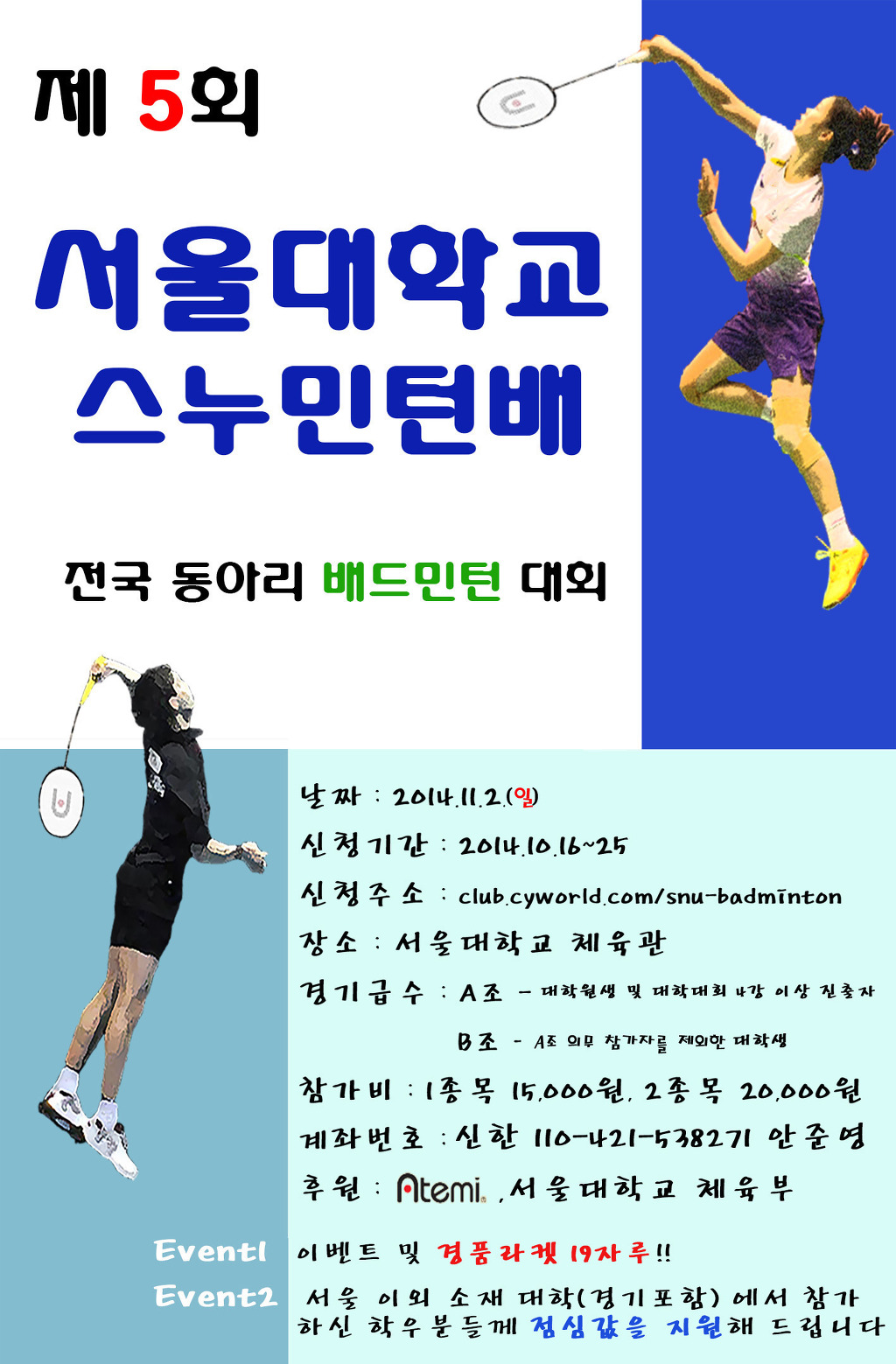 제5회 서울대학교 스누민턴배 전국 동아리 배드민턴대회 안내입니다. 작성자서울대강성우|작성시간14.10.09|조회수410 목록 댓글 0 글자크기 작게가 글자크기 크게가 서울대_체육관_오는길.docx 제5회_스누민턴배_전국_대학_배드민턴_동아리_대회_공문.hwp 참가신청서.xlsx 첨부파일첨부된 파일이 4개 있습니다. jpg 파일 제_5회_서울대_스누민턴배_대회_포스터_최종.jpg 다운로드 docx 파일 서울대_체육관_오는길.docx 다운로드 hwp 파일 제5회_스누민턴배_전국_대학_배드민턴_동아리_대회_공문.hwp 다운로드 xlsx 파일 참가신청서.xlsx 다운로드 다음검색 현재 게시글 추가 기능 열기 북마크 신고 센터로 신고 댓글 댓글 0 댓글쓰기 답글쓰기 댓글 리스트