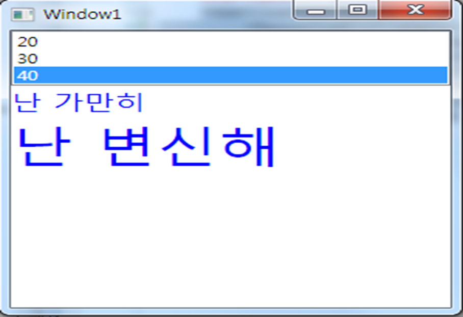 <Window.Resources> <Style TargetType="TextBlock" x:Key="FontStyle"> <Setter Property="FontSize" Value="20" /> <Setter Property="Foreground" Value="Blue" /> </Style> </Window.Resources> <StackPanel> <ListBox Name="lbox_fsize" electi[안내]태그제한으로등록되지않습니다-xxonChanged="lbox_fsize_Selecti[안내]태그제한으로등록되지않습니다-xxonChanged"> <ListBoxItem Content="20" /> <ListBoxItem Content="30" /> <ListBoxItem Content="40" /> </ListBox> <TextBlock Name="sbox" Style="{StaticResource FontStyle}" Text="난 가만히" /> <TextBlock Name="dbox" Style="{DynamicResource FontStyle}" Text="난 변신해" /> </StackPanel> |