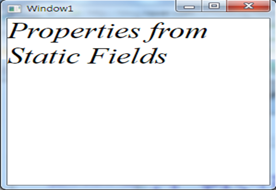 <Window x:Class="wpf2.Window1" xmlns="http://schemas.microsoft.com/winfx/2006/xaml/presentation" xmlns:x="http://schemas.microsoft.com/winfx/2006/xaml" xmlns:src="clr-namespace:wpf2" Title="Window1" Height="300" Width="300"> <TextBlock FontSize="{x:Static src:Contants.FontSize}" > <TextBlock.FontFamily> <x:Static Member="src:Contants.fnfm"></x:Static> </TextBlock.FontFamily>Properties from<LineBreak/>Static Fields </TextBlock> </Window> |