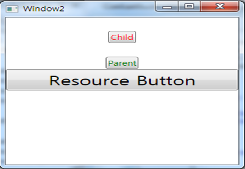<StackPanel Name="parent"> <StackPanel.Resources> <Button x:Key="btn" FontSize="24" Content="Resource Button"></Button> <SolidColorBrush x:Key="brushtext" Color="Green"></SolidColorBrush> </StackPanel.Resources> <StackPanel Name="child"> <StackPanel.Resources> <SolidColorBrush x:Key="brushtext" Color="Red"></SolidColorBrush> </StackPanel.Resources> <Button Margin="24" Content="Child" HorizontalAlignment="Center" Foreground="{StaticResource brushtext}"></Button> </StackPanel> <Button Content="Parent" HorizontalAlignment="Center" Foreground="{StaticResource brushtext}"></Button> <StaticResource ResourceKey="btn"></StaticResource> </StackPanel> |