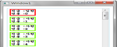 Border부분을 itemBorder로 해주고 해당 데이터가 올 때마다 StackPanel로 직급과 연봉을 설정하고 데이터 바인딩하여 데이터를 넣어주었다. 데이터 트리거부분으로 바인딩 된 부분과 Value가 일치하면 BorderBrush를 Red로 바꿔주도록 설정하였다. | |