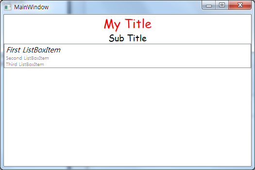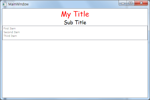 <!—Xaml--> <StackPanel> <TextBlock Style="{StaticResource TitleSt}" Name="title" Text="My Title" /> <TextBlock Name="subtitle" Text="Sub Title"/> <ListBox Name="listbox"> <ListBoxItem Content="First Item" /> <ListBoxItem Content="Second Item" /> <ListBoxItem Content="Third Item" /> </ListBox> </StackPanel>