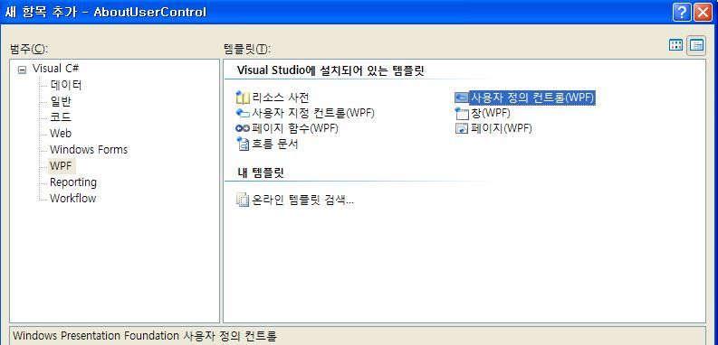 새 항목 추가 탭을 누른 뒤에 WPF 범주에서 사용자 정의 컨트롤을 추가해 줍니다. 사용자 정의 컨트롤과 사용자 지정 컨트롤은 서로 다른 것이니 주의 하시기 바랍니다. 영문 버전에서는 UserControl과 CustomControl로 구별 됩니다. 추가를 했다면 새로 추가한 UserControl에 밑의 XAML 코드와 C# 코드를 추가하여 기능을 가지고 있는 UserControl로 만들어 줍니다.