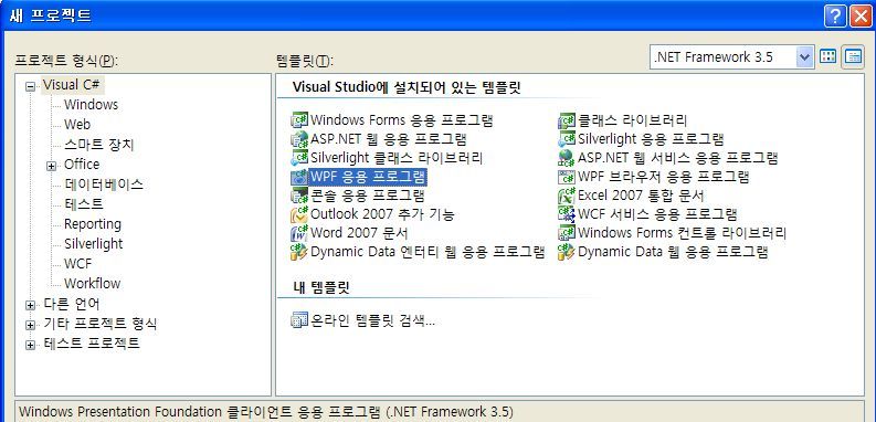 새 프로젝트 만들기를 통해서 WPF 응용 프로그램을 하나 만들어 줍니다.