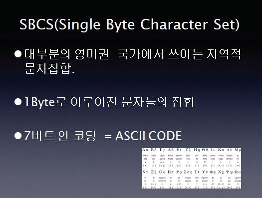 문자집합 입니다. 1바이트로 이루어 졌지만, 알파벳의 변형이 있는 독일어나 불어, 그리고 알파벳과 모양이 완전히 다른 그리스어, 러시아어는 전혀 표시 할 수 없습니다.