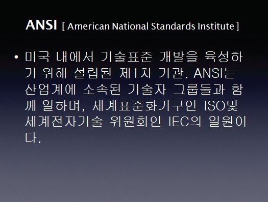 ISO(International Organization for Standardization) 및 세계전자기술위원회인 IEC(International Electro-technical Commission)의 일원입니다. ANSI가 제정한 컴퓨터에 관한 표준 중 대표적인 것으로는 아스키가 있습니다.