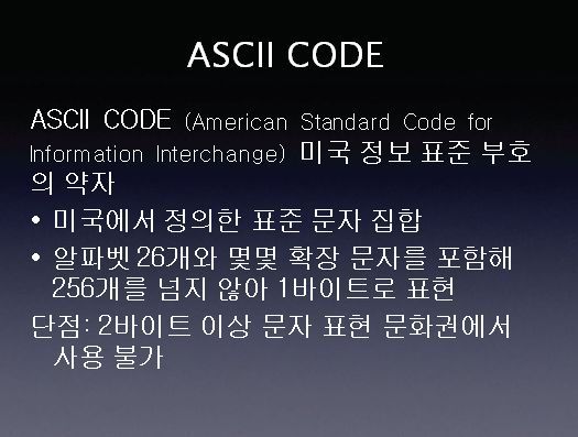 ASCII 코드는 American Standard Code for Information Interchange 미국 정보 표준 부호의 약자 이다. 영문 알파벳을 사용하는 대표적인 문자 인 코딩으로써 컴퓨터와 통신장비를 비롯한 문자를 사용하는 많은 장치에서 사용되었습니다. 문제점은 앞에서 봤듯이 2바이트 문자를 사용하는 문화권에서는 사용이 불가능 하다는 점입니다.