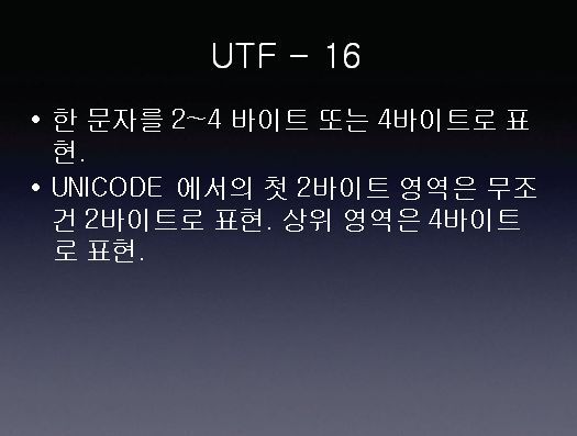 UTF 16은 문자를 2~4 바이트의 가변적인 방법으로 표현합니다.