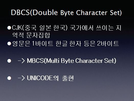 다음은 DBCS 이다. CJK 국가에서는 문자(중국은 한자, 일본의 한자와 가나 문자, 한국의 초, 중, 종성을 조합한 문자체계)의 수가 엄청나게 많기