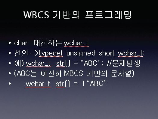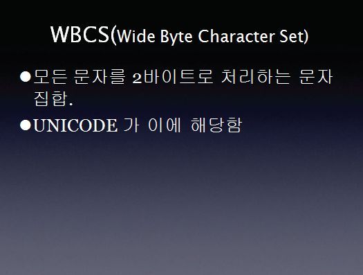다음은 WBCS 입니다. WBCS는 모든 문자를 2바이트로 처리하는 문자로써 유니코드가 이에 해당 합니다. 자세한 사항은 다음장에서 설명 하겠습니다.