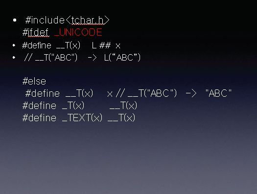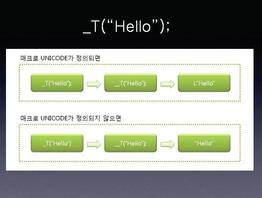 매크로 _UNICODE가 정의되었다면 L이 붙을 것이고 __T(“Hello”); -> L “Hello” 정의되어 있지 않다면 그대로 __T(“Hello”); -> “Hello” 될 것입니다.