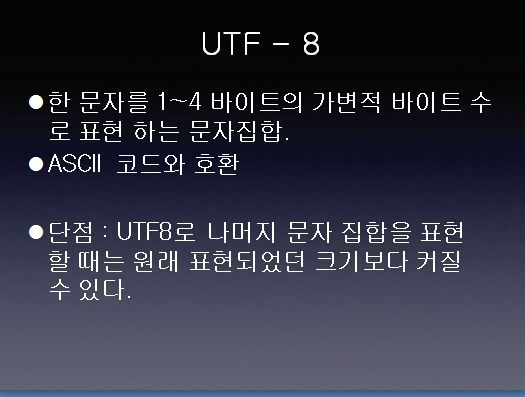 UTF-8과 UTF-16은 모두 MBCS에 속해 있는 문자집합 입니다. UTF-8은 ASCII 코드와의 호환성을 목표로 개발된 문자집합으로, ASCII 코드의 영역은 그대로 내포하고 있으며 그 외의 영역을 표시로 해서 ASCII 외의 영역을 사용하는 방법 입니다.