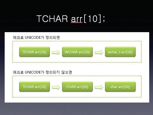 TCHAR arr[10]; 을 선언 했을때, 매크로 UNICODE가 정의되어 있다면 TCHAR arr[10];은 MBCS기반으로 정의되어 있지않다면 WBCS 기반의 문자열로 바뀌게 됩니다.