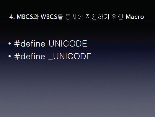 우리는 문자집합을 어느 하나로 정해서 프로그래밍을 한다고 할 경우 현존하는 모든 시스템에서 완벽히 유니코드를 지원하지 않을 경우에는 어떻게 할것인가 라는 문제가 있습니다. 이것을 해결하기 위한 매크로가 있습니다. UNICODE는 API 함수의 유니코드이며 _UNICODE는 C함수의 유니코드입니다.