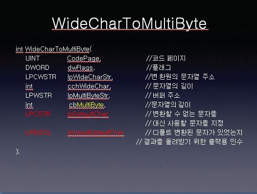 WideCharToMultiByte 와 다른점은 두가지의 인수가 더 포함된다는 점입니다. lpDefalitChar 는 변환할 수없는 문자를 대신 사용할 문자를 지정하며, lpUsedDefaultChar 인수는 디폴트 변환된 문자가 있었는지의 여부를 돌려 받기 위한 출력용 함수이다. 디폴트 변환을 별도로 지정하지 않을 경우 두 인수를 모두 NULL 로 지정할 수 있는데, 이렇게 되면 시스템의 디폴트 값이 사용됩니다.