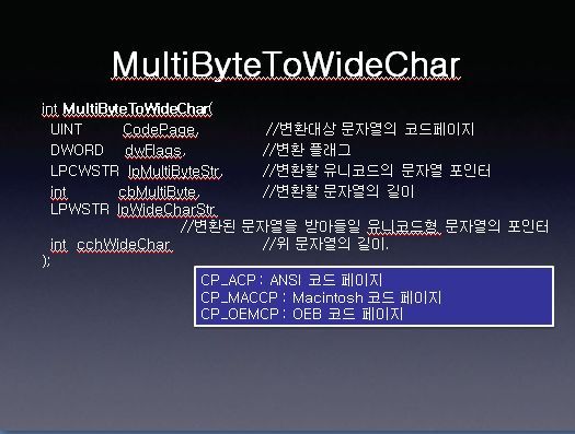 첫번째 변수의 파라미터에는 3가지가 존재합니다. 대부분 ANSI코드 페이지를 변환하는 CP_ACP를 많이 쓰게 될