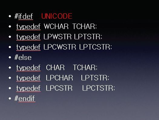Windows.h 에서는 MBCS와 WBCS를 동시에 수용하는 형태의 프로그램을 구현하기 위해서 이와 같은 형태의 매크로를 정의 하고 있습니다. 이 매크로가 사용되는 예는 다음과 같습니다.