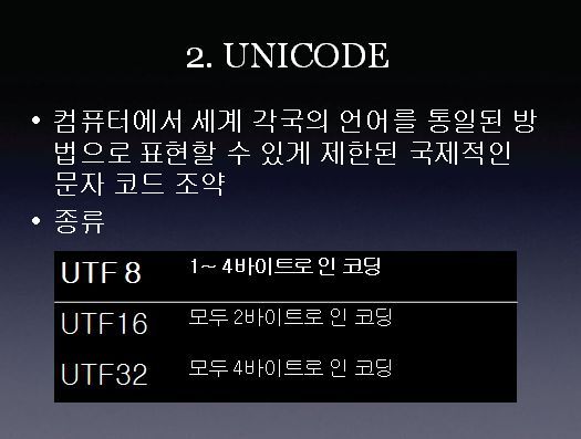 유니코드는 각각의 다른 나라의 언어를 시스템의 호환성 및 확장성에 문제를 일으키는 관계로 이를 하나의 문자인 유니코드로 통합시키는 방법입니다. 종류는 UTF8, UTF16, UTF32등이 있습니다. UTF는 (Universal character set Transformation Format )의 약자로써 16비트 유니코드 문자를 7비트 또는 8비트 문자로 변환하기 위한 방법입니다.