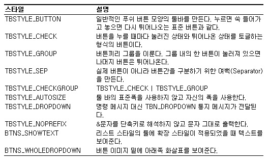 툴 바 자체의 스타일을 지정해주는데 WS_CHILD나 WS_VISIBLE은 반드시 있어야 한다. 이외에 툴 바에 줄 수 있는 고유의 스타일들이 있는데 이 스타일에 따라 툴 바의 모양이나 동작에 많은 차이가 발생하게 된다.